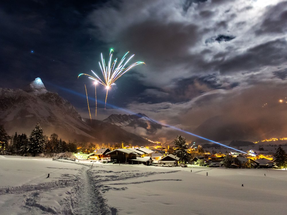 We welcome the new year 2026 with our annual fireworks display. From our hotel terrace you have a great view of the valley basin „Moos“ and our fireworks. The logs glow on the terrace and provide a little warmth on New Year's Eve
